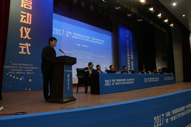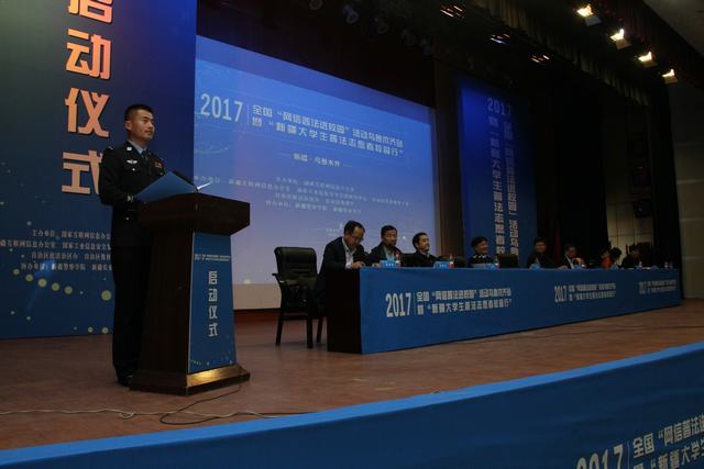 新疆警察学院志愿者代表陈楷同学向广大高校师生发出“依法上网、文明上网、争做中国好网民”的倡议书,希望大家普及网信法律,弘扬社会主义法治精神,让依法上网、文明上网成为广大师生的共同行动;维护网络秩序,践行网络文明,让互联网始终在法治的轨道上健康运行。
