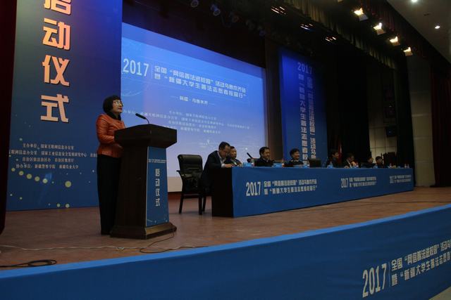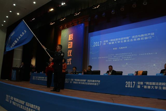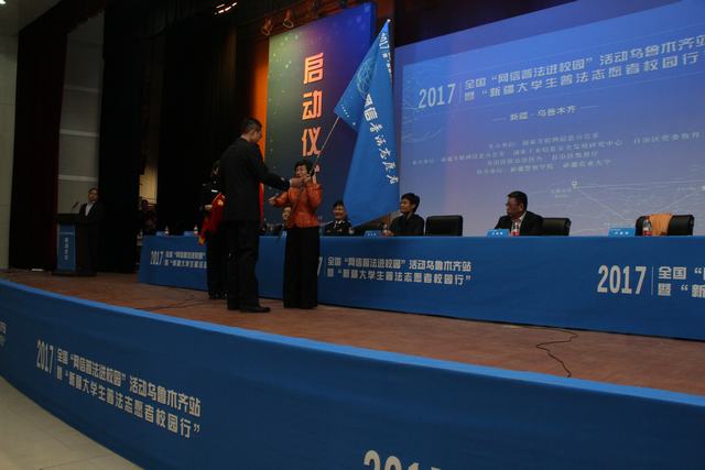 自治区党委网信办(新疆股联网信息办公室)专职副主任卢春萍同志为新疆大学生普法志愿者授旗,并宣布2017全国“网信普法进校园”活动乌鲁木齐站暨“新疆大学生普法志愿者校园行”活动正式启动。