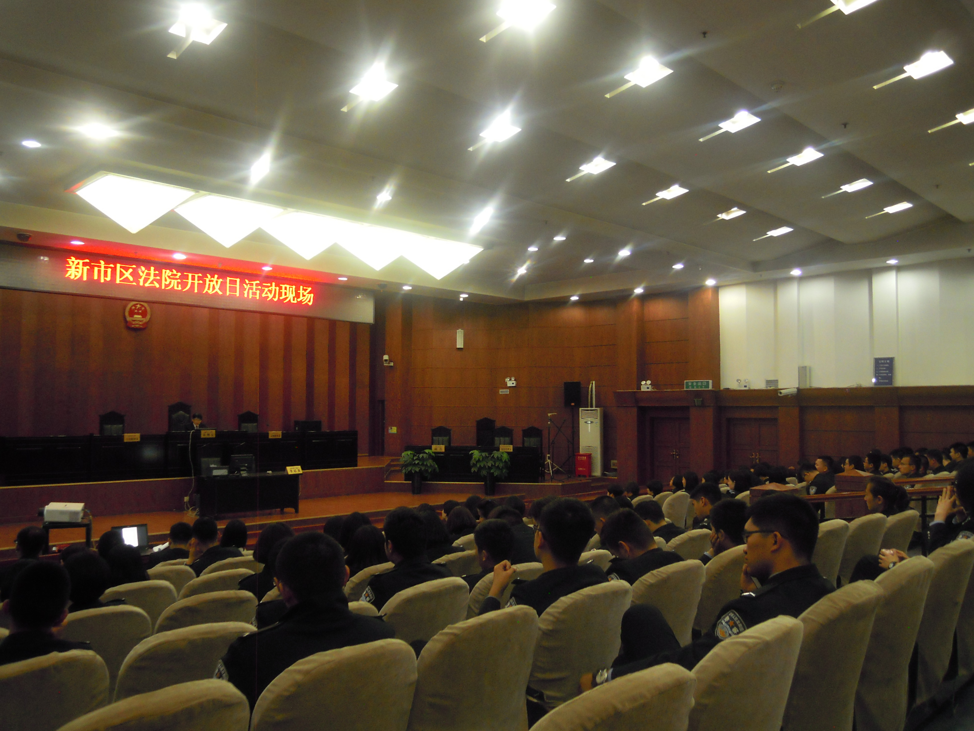 为了进一步做好法学专业的实训课程、提高学生实践操作能力,2016年5月5日上午,新疆警察学院法律系委派徐莉、闫芳、阿合买提、穆斯塔基甫老师组织2012级本科大队法学专业一中队一区、二区和2015级本科大队法学专业二中队三区的共一百四十余名学员到乌鲁木齐市新市区人民法院旁听庭审。