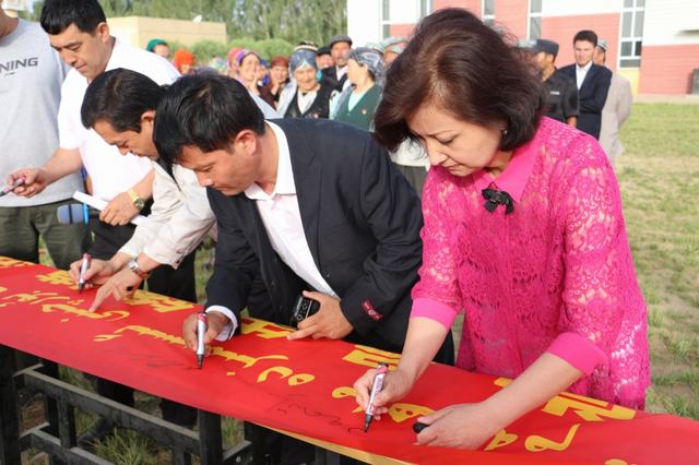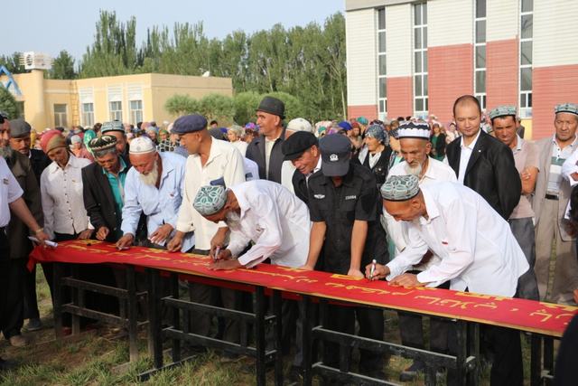 工作组和村全体党员护送党旗到宣誓台前,面对党旗庄严宣誓,重温入党誓词。工作组总领队、临时党支部书记帕提曼·吐尔逊和村党支部书记阿不都热依木·吐松与全体党员一起依次在“牢记党的光荣使命,切实发挥党员先锋模范作用”横幅上签字。