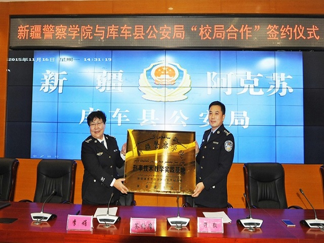 根据自治区公安厅《关于加强新疆警察学院与公安实战单位“校局合作”工作的意见》(新公通[2014]19号),经双方研究决定,学院与阿克苏地区库车县公安局建立全方位“校局合作”关系。并于2015年11月16日上午,在库车县公安局隆重举行学院与阿克苏地区库车县公安局《校局合作框架协议》签字及“新疆警察学院刑事技术教学实践基地”挂牌仪式。学院党委副书记、院长李娟,刑事科学技术系主任吾提克尔·吾守尔,教务处副处长闫文,阿克苏地区公安局副局长、库车县委常委、库车县公安局党委书记、局长缪毅,库车县公安局党委副书记、副局长张标,库车县公安局副政委宋嘉斌,库车县公安局副局长李斌及库车县公安局纪委书记魏强等参加了仪式。