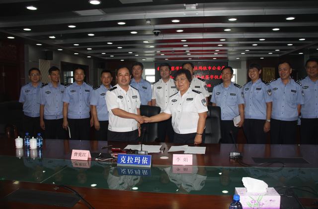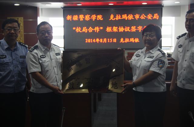 2014年8月15日下午,学院与克拉玛依市公安局“校局合作”框架协议签字及新疆警察学院教学实践基地挂牌仪式在克拉玛依市公安局指挥大厅隆重举行。学院党委副书记、院长李娟,教务处处长曹修伟,公安管理系主任王程辉,治安系主任孙常平;克拉玛依市公安局党委书记、局长曾宪江,副局长李剑、张振俊,政治处主任吕召龙等领导同志以及学院相关系部教研室负责人、克拉玛依市公安局国保、治安、刑侦、交警、信通等业务部门负责人共计20余人参加了仪式。签字及挂牌仪式之前,“校局”双方还就公安实际需求的人才标准、信息化条件下公安工作发展的新趋势、新特点,以及公安教育和培训工作如何贴近、适应公安专业工作需要,努力加强针对性等双方关注关心的问题进行了深入的交流和热烈的讨论,达成了众多的共识。应曾宪江局长邀请,李娟院长一行还分别参观了克拉玛依市公安局指挥中心、刑事科学技术实验室、克拉玛依市公安局石莫治安派出所。
