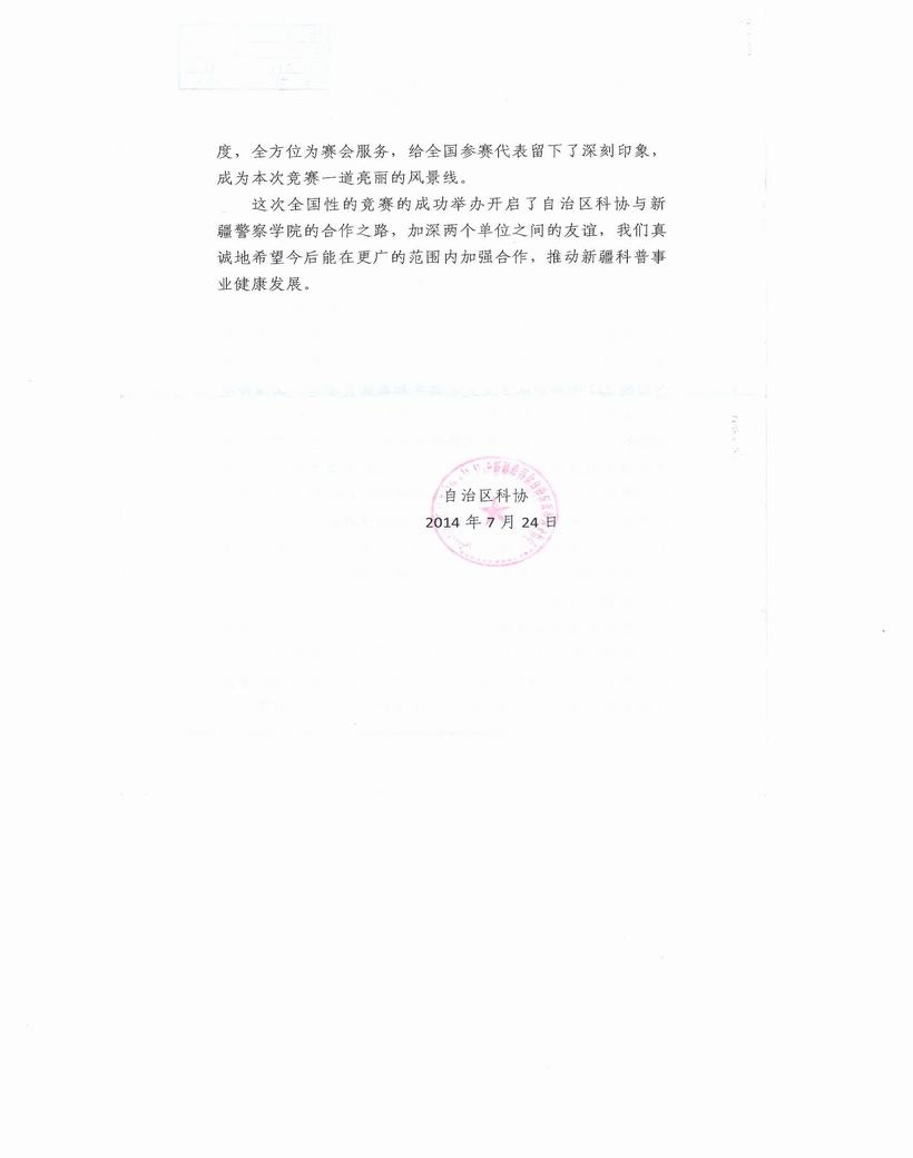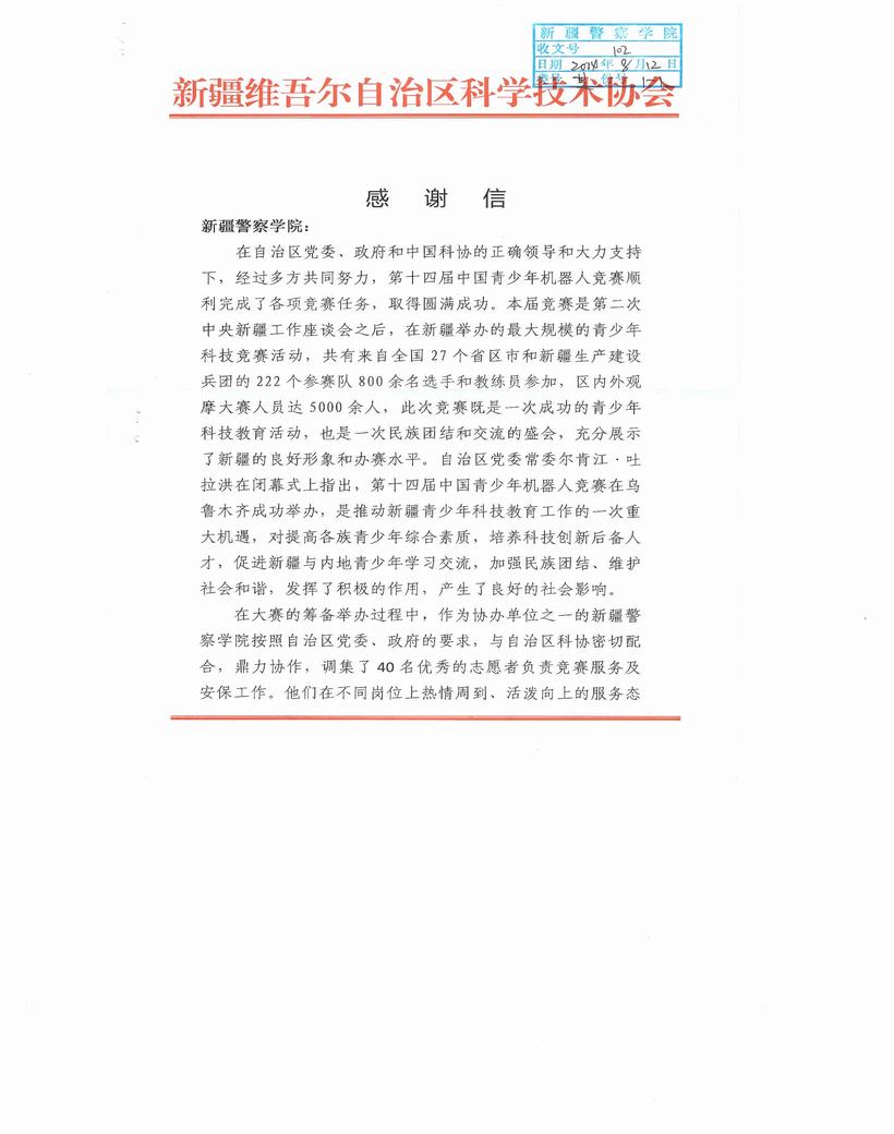 自治区科协致我院的感谢信