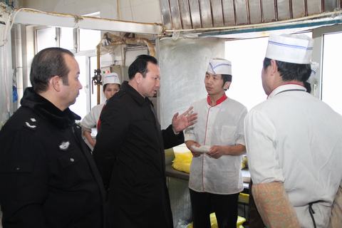 12月6日下午,校党委委员、纪检委书记艾尔肯·依不拉依木组织纪检委、校办、学生处的同志对北校区学员民、汉餐厅、综合楼一楼商店、二至三楼餐厅进行了检查。在学员餐厅,艾书记与各窗口负责人一一进行交流,详细了解学生食堂蔬菜、粮油、肉食进货渠道,并深入后堂认真查看学生伙食状况,逐一核查从业人员卫生许可证。检查组全面检查食堂后堂卫生及安全状况,对各餐厅存在的问题提出整改意见,要求限期改正。在检查中,艾书记要求各餐厅要严把进货渠道,严格食堂卫生,确保饭菜数量、质量,为学生提供优质报务。