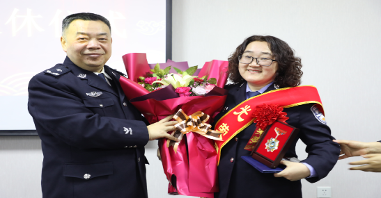 学院领导为退休人民警察颁发退休纪念章、荣誉证书,赠送鲜花并合影留念。
