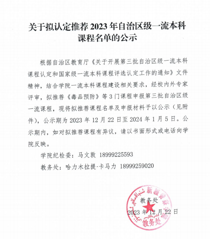 关于拟认定推荐2023年自治区级一流本科课程名单的公示