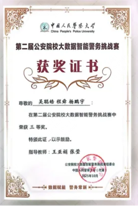 10月18日,第二届公安院校大数据智能警务挑战赛在中国人民警察大学圆满落幕。学院信息安全工程系学警吴聪皓、程舜、杨鹏宇提交的数据分析报告《跨平台资金流异常检测与案件研判》荣获大赛“三等奖”,特此祝贺。